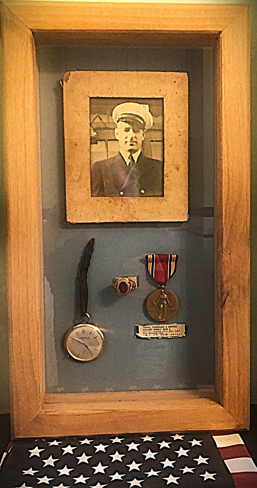 Almost in the middle of the shadowbox is a gold ring. I recently saw the Tom Hank movie “Greyhound.” It’s about a sea battle between his destroyer and a German submarine, and his ring looked exactly like the one in the Shadowbox.