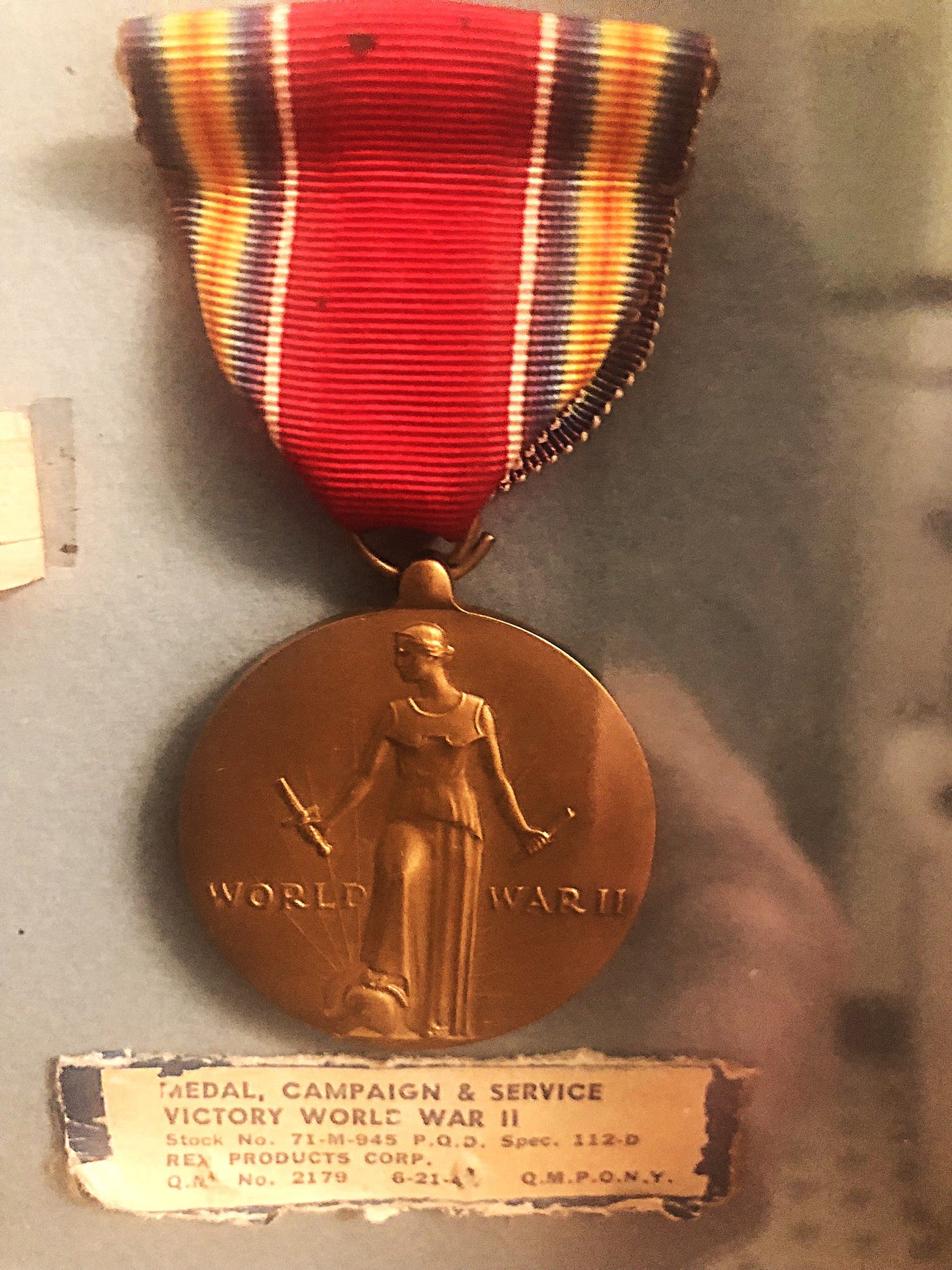 Sometime after the war ended and he was back in San Francisco living with my mother, who moved there from Mississippi, he received a victory medal for his service during the war. It came in a blue cardboard box, which he kept in his bedside table for as long as I can remember. After it disappeared, it was returned to me by Dad’s neighbor. How he got it, I never knew. When he gave it to me, the box was tattered and falling apart. I saved the label from the end of the box, and placed it just under the medal. It reads