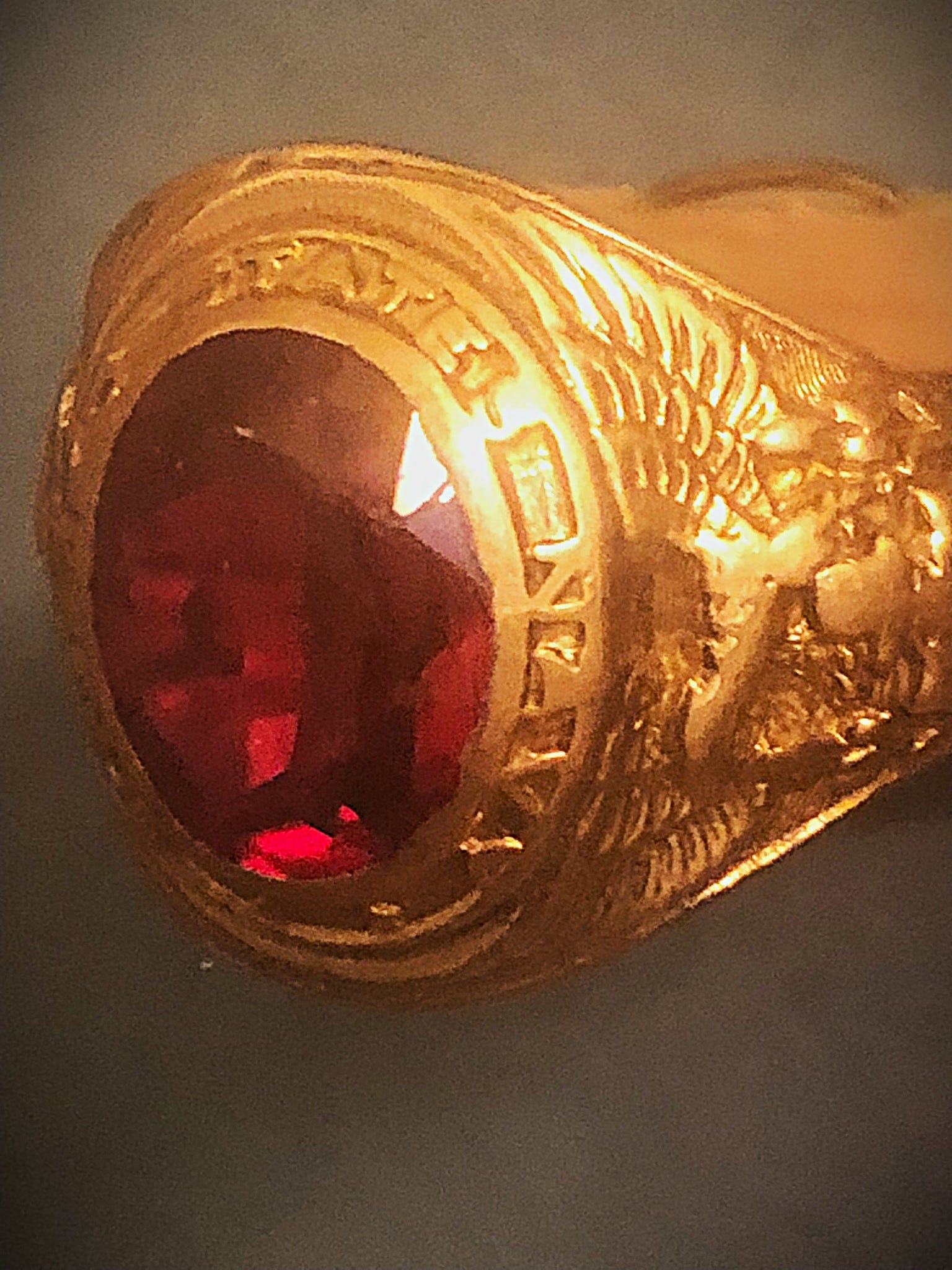 The center of the gold ring is a red diamond-cut garnet or synthetic ruby, symbolizing valor, courage, and sacrifice. Surrounding the stone are the words “UNITED STATES NAVY.” On the shanks to either side are the familiar Navy insignia of the rope and anchor. The rope symbolizes unity and connection to the sea, and the anchor represents steadfast service. He likely bought this ring after completing naval boot camp in San Diego, a popular tradition.