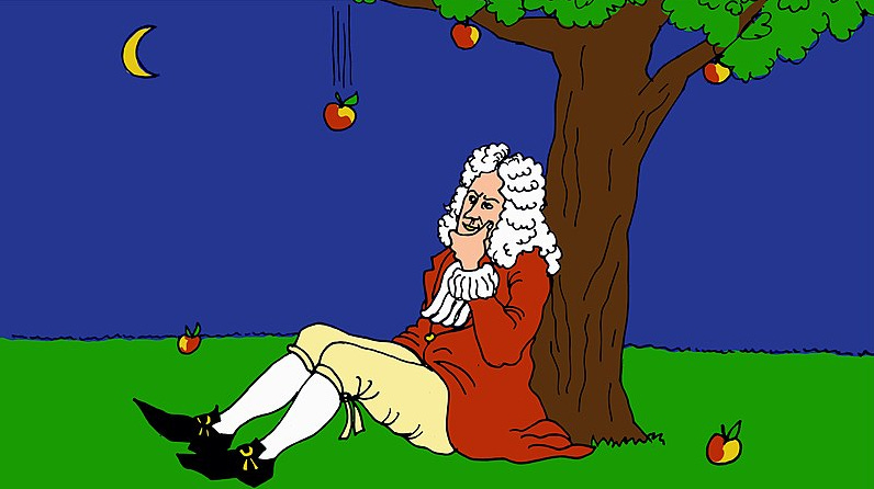 There’s Newton, chilling under an apple tree. His apple is firmly attached to the tree by its stem. But as the apple ripens over the months, it grows heavier, and the stem begins to dissolve at the joint. That small and subtle change makes the coming event inevitable. After defying gravity all season, in an unpredictable instant, the stem gives way to the force of gravity, and the apple begins to fall. If it starts from high up in the tree, it falls farther than one lower down. How long it falls becomes its history, and that becomes important later on.