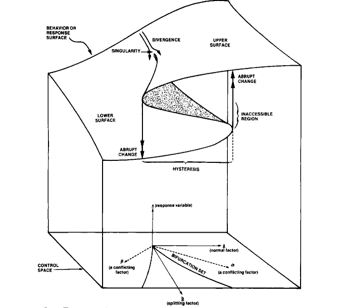 Here is a simple diagram of the catastrophe model. There is math behind this, but let’s not bother. Focus on the “Behavior Surface” and ignore the rest.